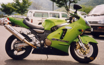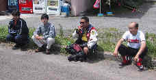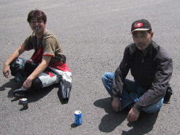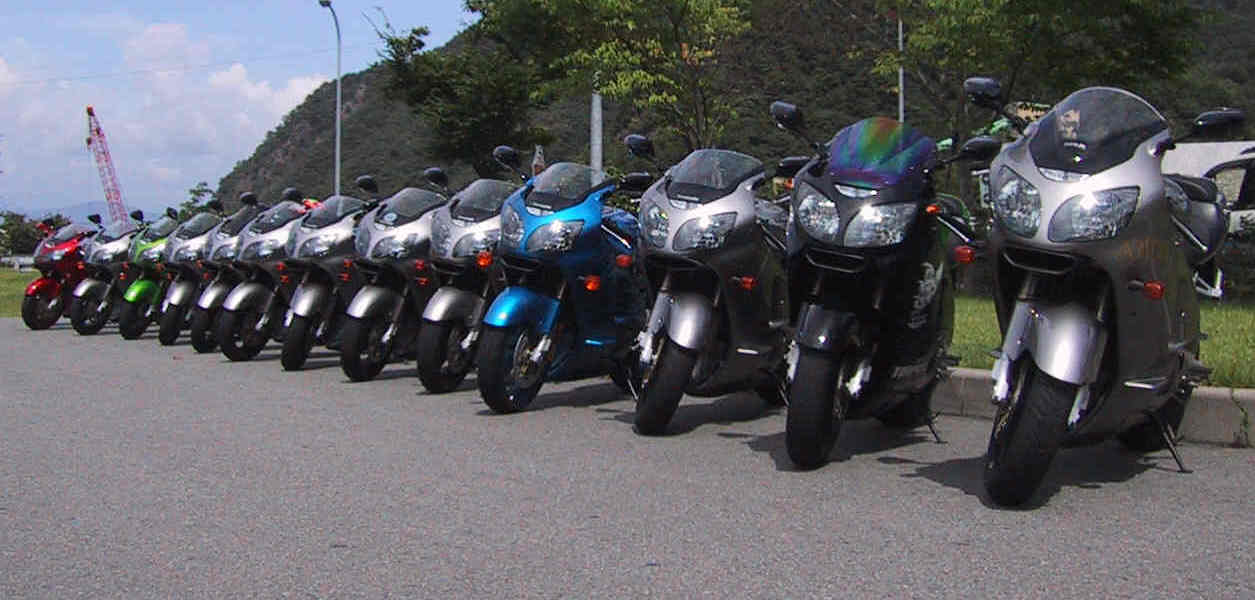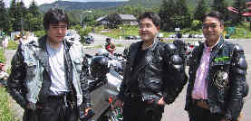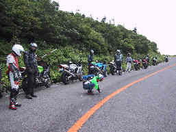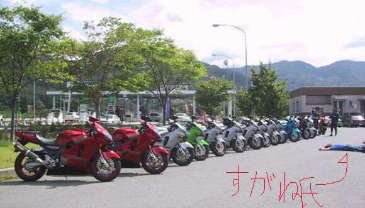 家族サービスのため8時まで帰ると言ってたのに長話になってしまいすみませんでした(無事ついたそうです、さすが12R乗り)キンチョーのためハラが痛くなりあわててコンビニへトイレを借りに行き、表に出たらあっしのアヤシイ12Rのところに人影が・・・・・すがちゃんである!す〜ぱ〜ぶらっくば〜ど(おのぴ〜)と一緒に爽やかに現れた彼らは私のことを「怖い」人だと思っていたらしく、爆笑していた、その後お約束のコーヒーブレイク、んで永遠にこのままで楽しいのにとおもいつつ朝レンに出発(考えてみれば朝レンのために早起きしたのにダベってるのが楽しくてしかたなかったのであるが・・・・本末転倒ですな)いざ!エコーラインへ!若干観光客&壊れダンプのおかげでスローペースであったが、やっぱしバイクっていーやねっ!ってなもんでミーティングスペース到着、某自動車学校教官のニンジャ乗り(ぱぱの友人)達も早々に引き上げ、集合時間も迫ってきたので蔵王ICに向けて走るわしらを西蔵王ではカラスが横切り怖い思いをしつつもなんとか到着!!!!!な〜んと、予想をはるかに上回る愛すべきバイク馬鹿たちが待ってました